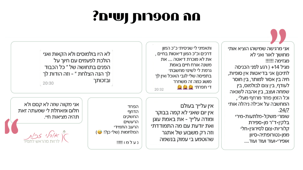 אני איתך בקבוצת ווטסאפ סגורה לכל שאלה, התייעצות וליווי שתצטרכי.